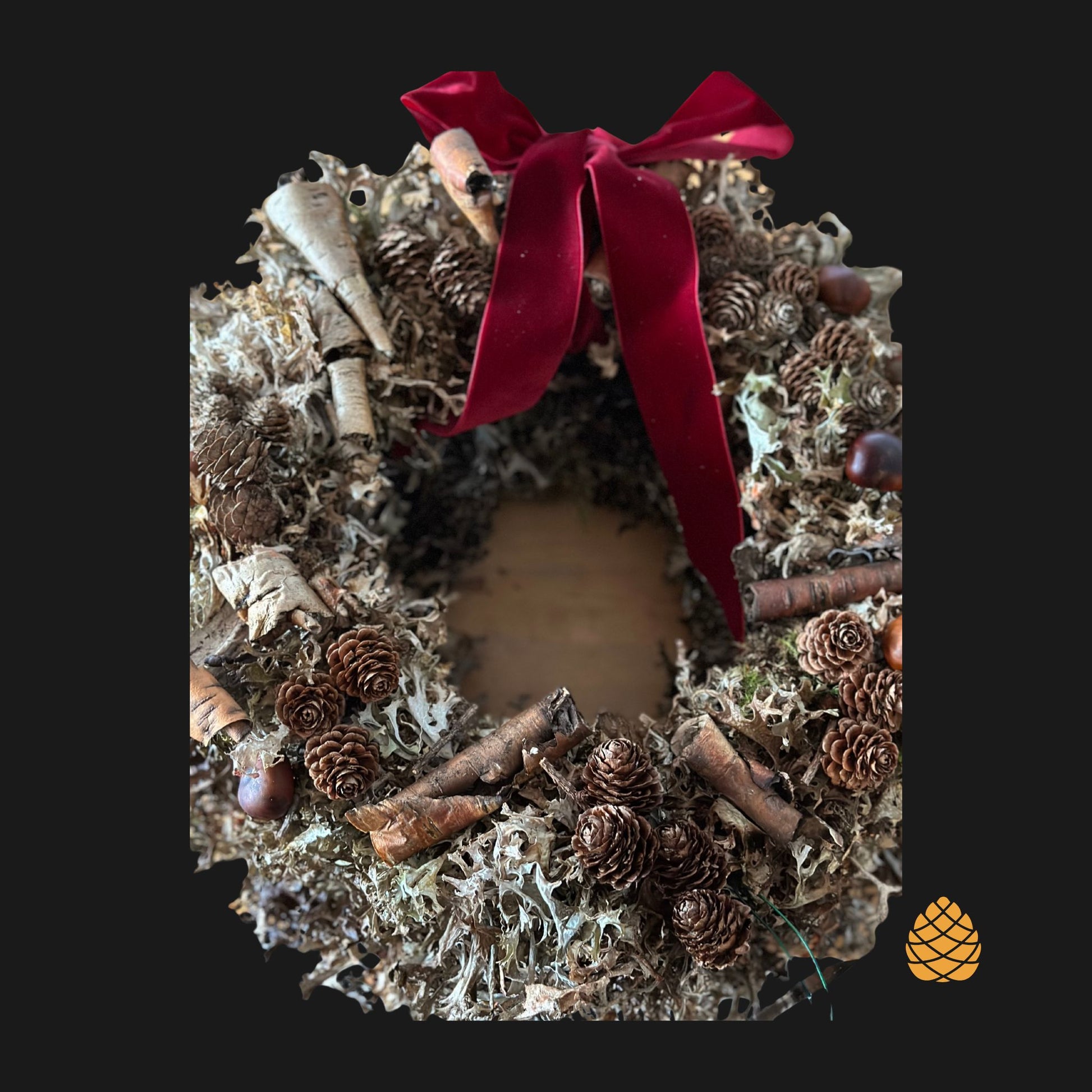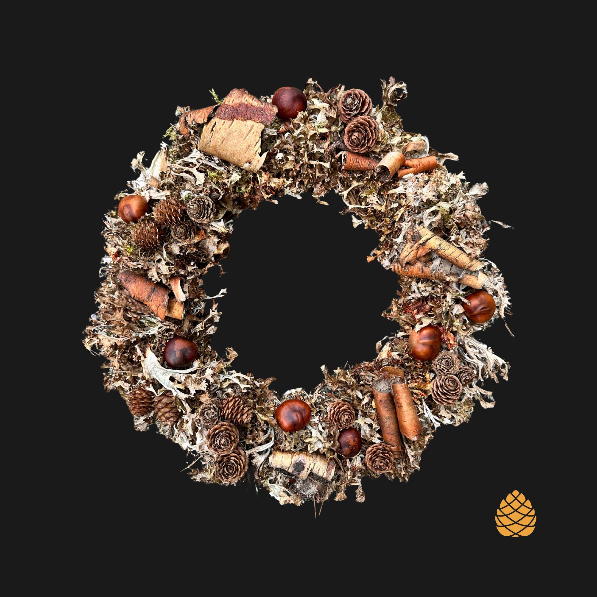 En krans satt sammen av fantastisk brødlav, kastanje og never funnet i norsk natur, kombinert med lerk fra litt sydligere strøk.